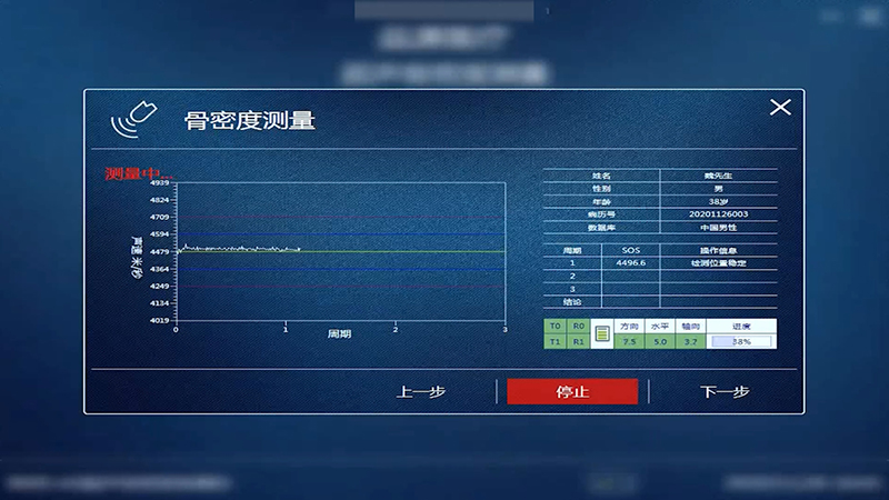 啟動(dòng)測(cè)量:完成上述設(shè)置及“校驗(yàn)”后,點(diǎn)擊軟件界面上的“開(kāi)始測(cè)量”按鈕。此時(shí),超聲骨密度儀開(kāi)始發(fā)射超聲波,對(duì)受檢部位的骨骼進(jìn)行檢測(cè)。在測(cè)量過(guò)程中,要求受檢者保持靜止,同時(shí),操作人員需密切關(guān)注儀器屏幕上的數(shù)據(jù)采集進(jìn)度條,等待測(cè)量過(guò)程自動(dòng)完成。通常,一次完整的測(cè)量過(guò)程可能需要數(shù)秒,具體時(shí)間取決于儀器型號(hào)和受檢者的個(gè)體差異。