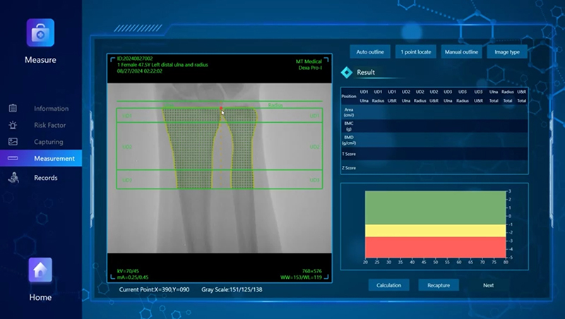 雙能X射線骨密度儀軟件:以雙能X射線骨密度儀DXA 800E為例,其軟件運(yùn)用雙能X射線吸收測(cè)量法,設(shè)備發(fā)射出低能和高能兩種不同能量的X射線束,同時(shí)照射人體骨骼部位,通過測(cè)量不同能量X射線穿過骨骼后的衰減程度,計(jì)算機(jī)精確計(jì)算出骨骼的礦物質(zhì)含量,即骨密度。該軟件操作簡(jiǎn)便快捷,整個(gè)檢查過程通常只需幾分鐘,能自動(dòng)生成專業(yè)報(bào)告,大幅提升科室工作效率。