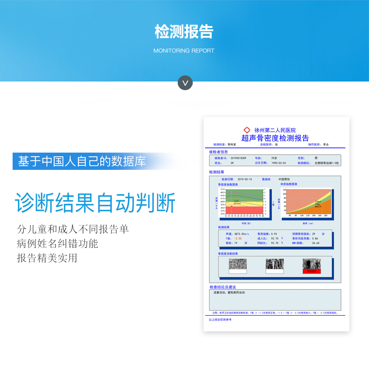 ■ 軟件優(yōu)勢::BMD-A系列超聲骨密度檢測儀一臺儀器裝配有智能分析系統(tǒng),經(jīng)濟(jì)實(shí)用。