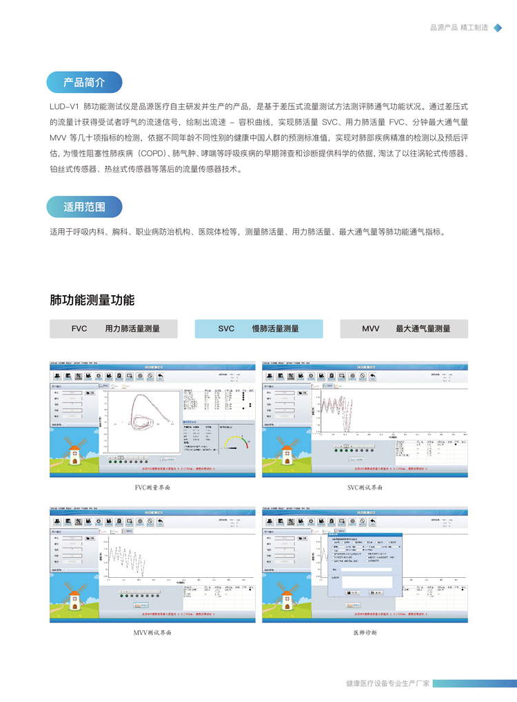 測(cè)量參數(shù):用力肺活量 (FVC) 、慢肺活量 (SVC) 、最大通氣量 (MVV)等